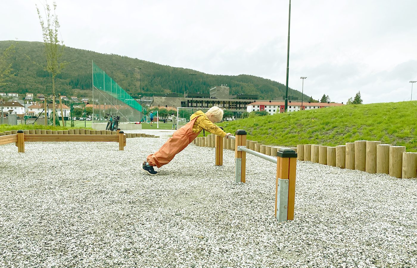 Området byr på gresskledde forhøyninger som inviterer til både utfoldelse og avslapping. Nye lekeapparater gir rom for barnas utforskertrang, mens voksne kan slå seg ned og følge med på livet rundt – enten det er fotballtrening på banen, hverdagsliv i nabolaget eller fallskjermhoppere som lander på sletten.