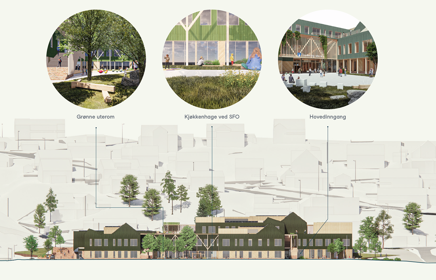 Naturen inspirerer hver dag sogndølene til et aktivt liv. Vi har latt oss engasjere av naturens mangfoldigheter, sykluser, egenrådighet og fornyelsesevner i formingen av uteområdene. Vi ønsker å legge til rette for fri lek, undersøking og mestring med en variasjon av de mange nedskalerte rom i forløp med åpne og samlende arealer. Utformingen forsøker å fremelske det rufsete og uferdige, som lar barnet selv sette rammer for lek og prestasjon, og å stadig finne sine favorittsteder.