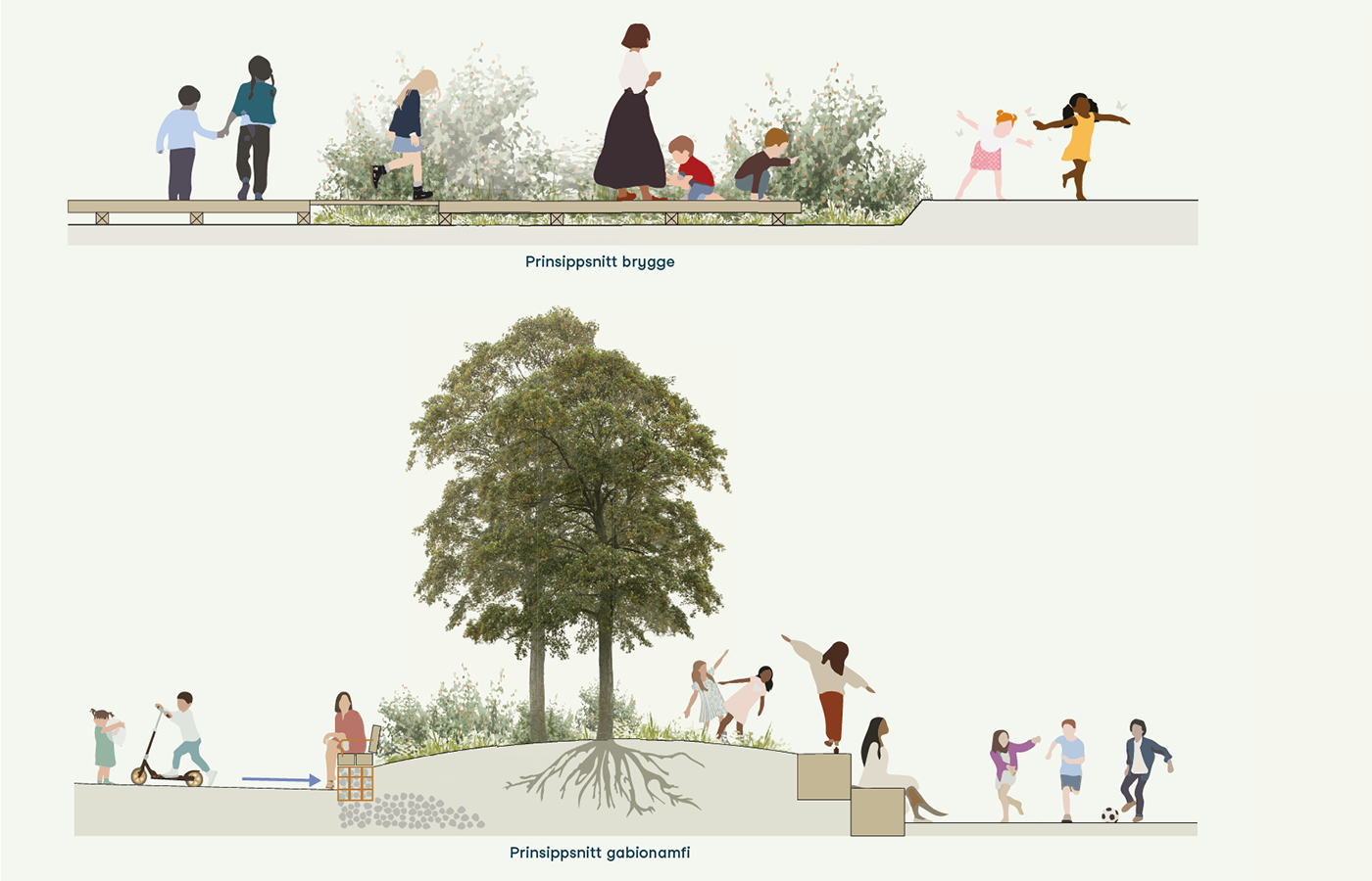 Sammen med et raust bygg som byr på seg selv, får leken spre seg over alle tilgjengelige flater, på tak og under tak, i trappene og bakkene, under buskene og mellom epletrærne. Barna skal finne lek de kjenner, og ikke minst finne opp leken selv.